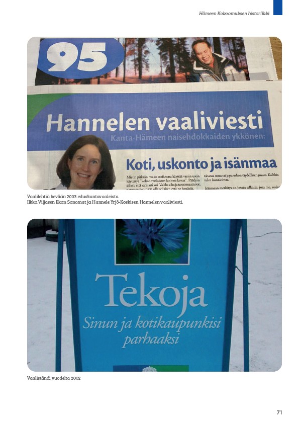 71 Hämeen Kokoomuksen historiikki Vaalilehtiä kevään 2003 eduskuntavaaleista. Ilkka Viljasen Ilkan Sanomat ja Hannele Yrjö-Koskisen Hannelen vaaliviesti. Vaaliständi vuodelta 2002